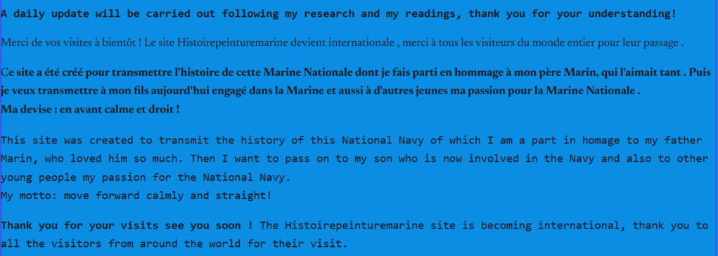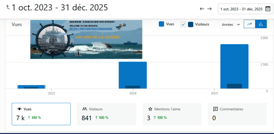 Merci à tous les visiteurs des 10 pays qui ont visité mon site internet cette première année car c’est grâce à vous que celui ci sur l’histoire de la Marine va continuer gratuitement; avec mon plus grand bonheur de partager avec vous ma passion chaque jours et merci aussi à tous mes abonnés des réseaux sociaux Facebook , X, Instagram et Linkedln .