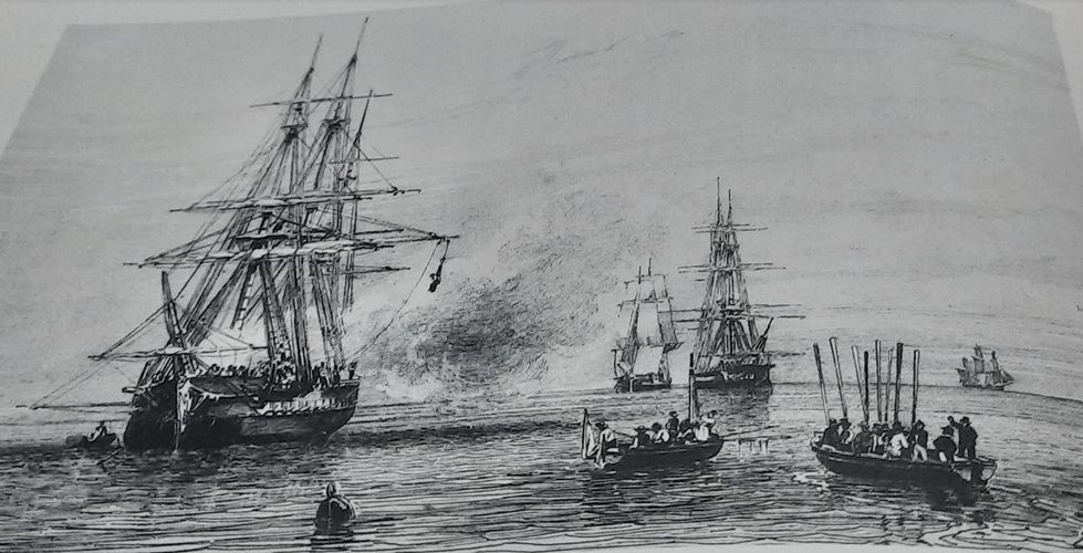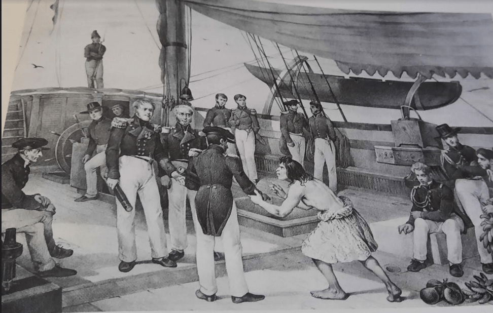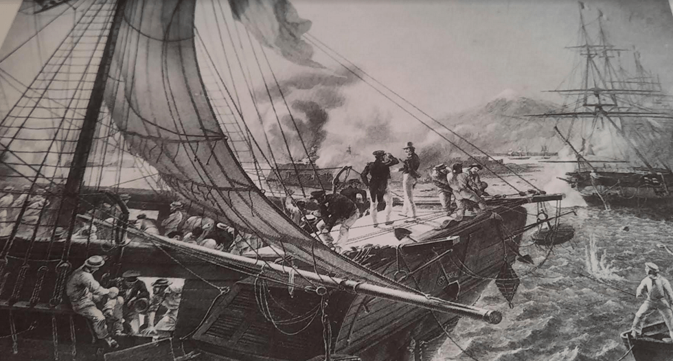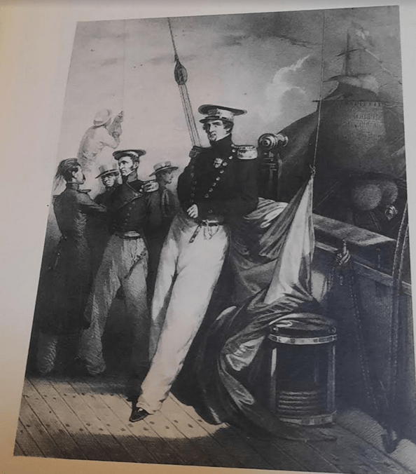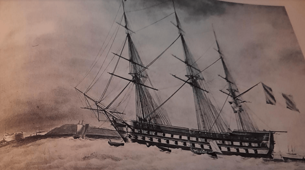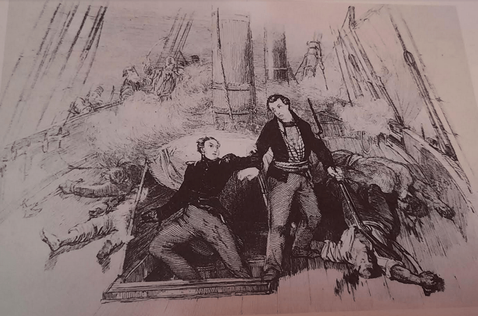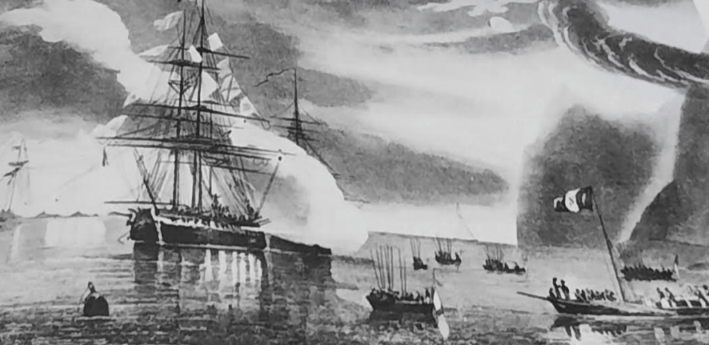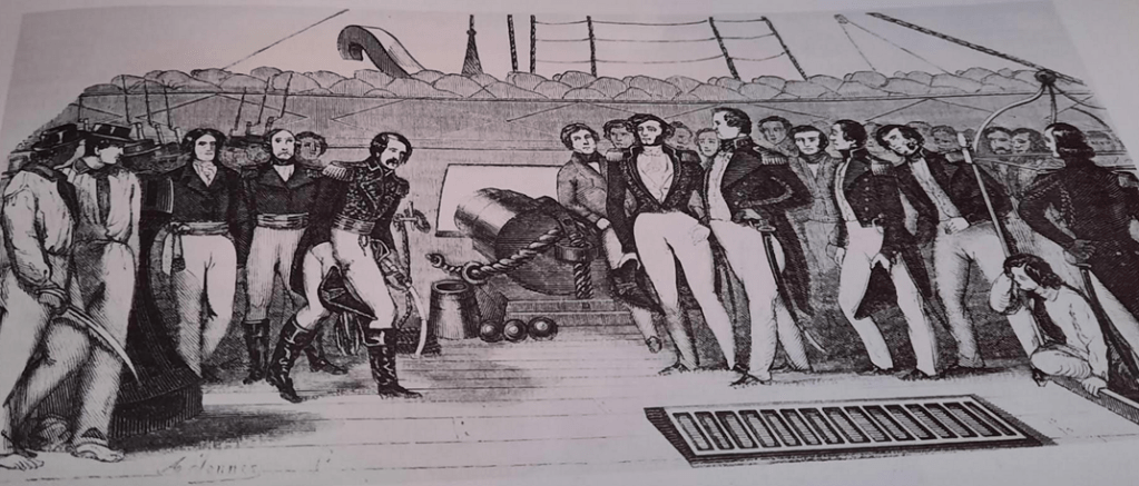 •Image de l’ expédition de Carthagène des Indes en 1834 et l’entrevue du Vice-Amiral de Mackau et du Général Lopez à bord de la frégate française l’Atalante .