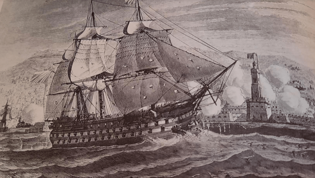 •Un coup de canon partit de la batterie du fanal et trois coups de canons furent tirer dur la Provence qui fut suivit d’une canonnade de toutes les pièces de la marine . Un vive canonnade d ’un suivit plus de 80 coups de canons et plusieurs bombes tombèrent sur l’arrière du vaisseau