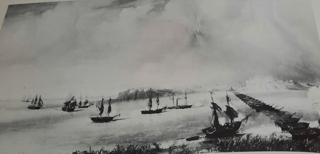 •L’ Amiral embossa les trois frégates Néréide, Gloire, Iphigénie celle-ci revenue de la Havane avec un équipage complété par celui du Brick le Duquesne et les deux bombardes alors il attaqua le fort !