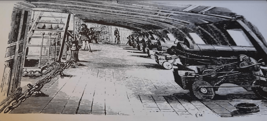 •Pendant que tous ces mouvements s’ opéraient sur les ponts les batteries inférieurs force principale du vaisseau ne sont pas restés inactives.